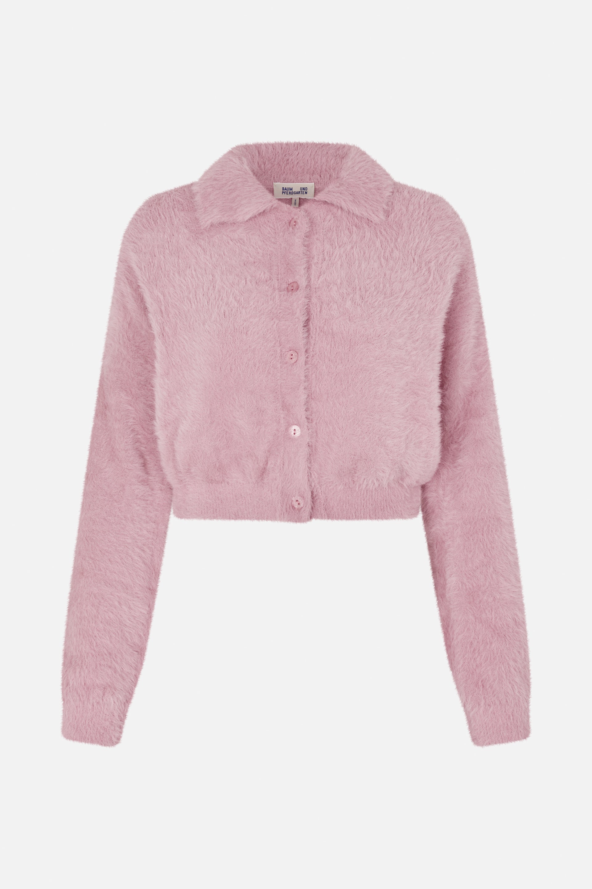 Conni Knit in de kleur 'Dawn Pink' van het Deense merk Baum und Pferdgarten. Een mooi boxy fluffy vest met een knoopsluiting en kraagje. Het vestje valt iets korter. Heel leuk om met een high-waisted jeans te combineren.