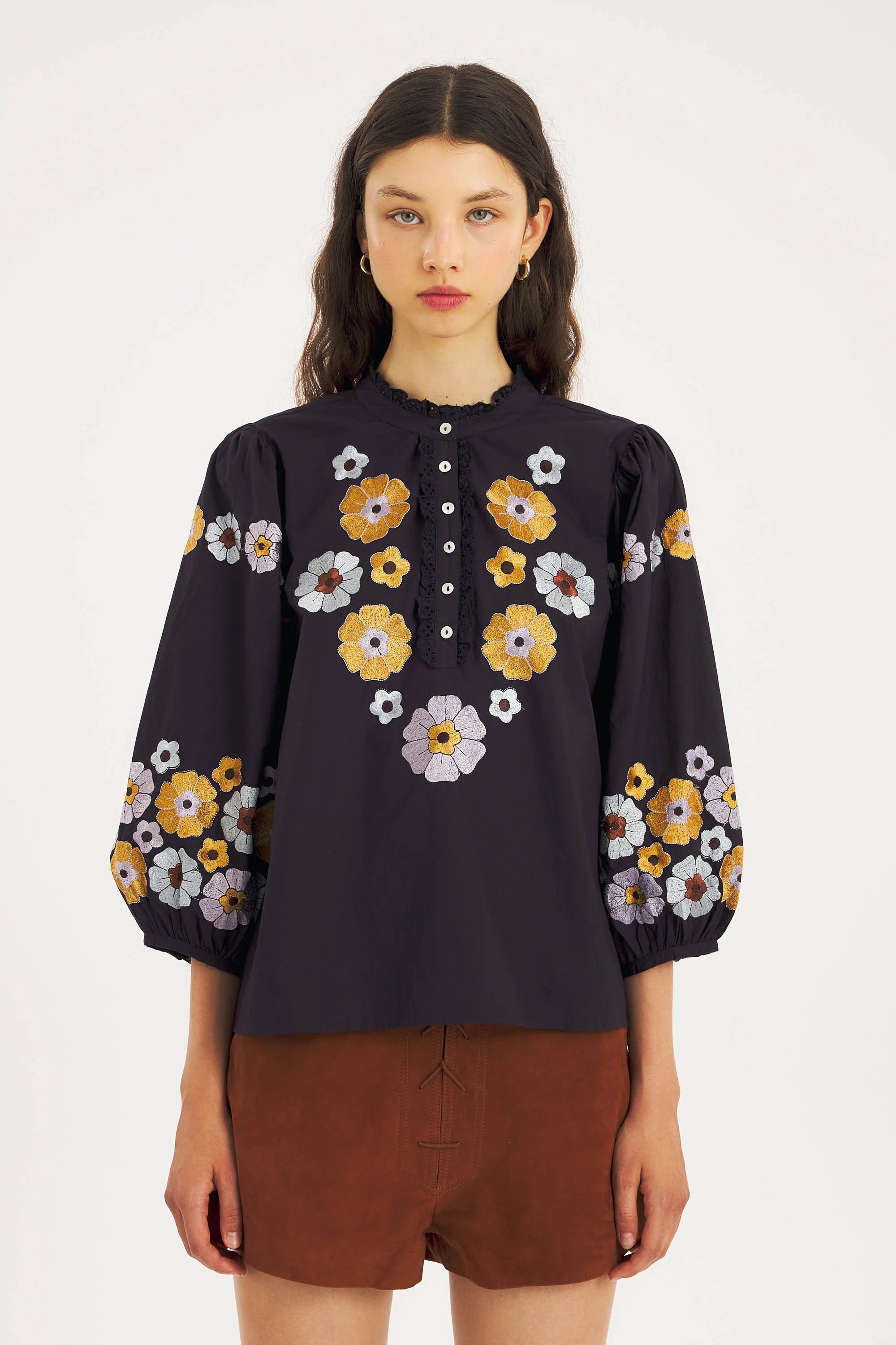 Amantina Blouse in de kleur 'Navy' van het Franse merk Antik Batik. Zachte katoenen poplin blouse versierd met zijdezachte bloemenborduursels in Mexicaanse stijl, die de borst en mouwen sieren. De sluiting en kraag zijn afgewerkt met kant, terwijl de mouwen wijdvallend zijn. Draag haar op een jeans en je bent gelijk af!