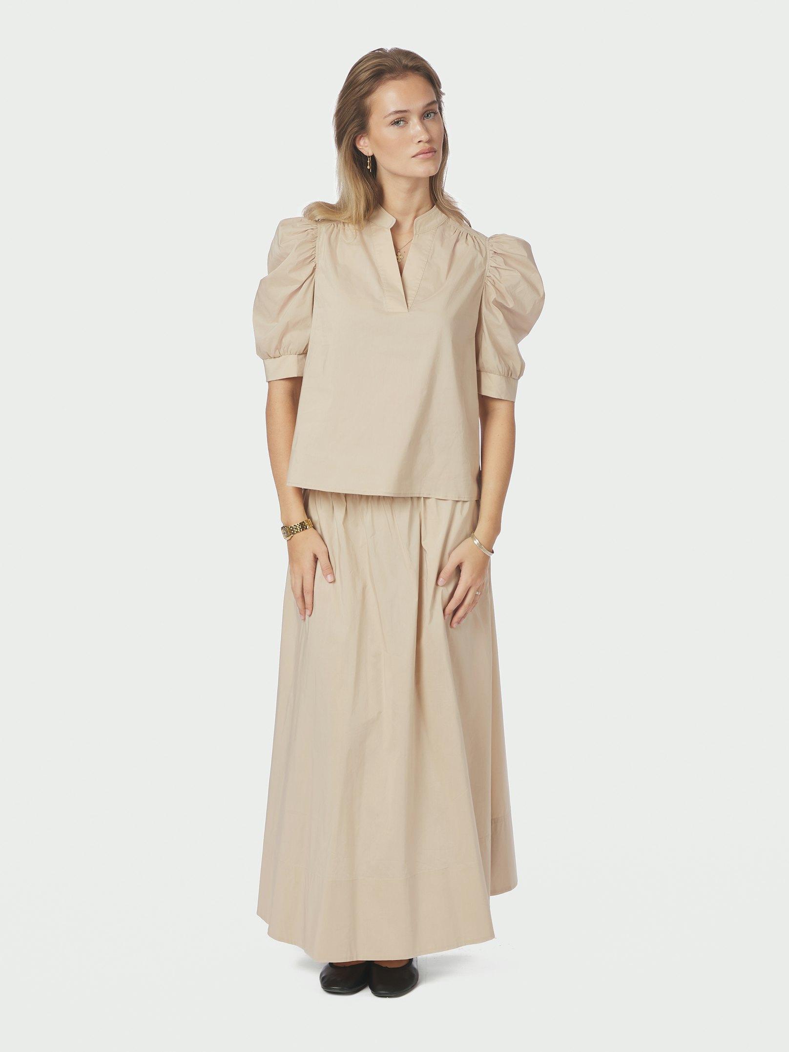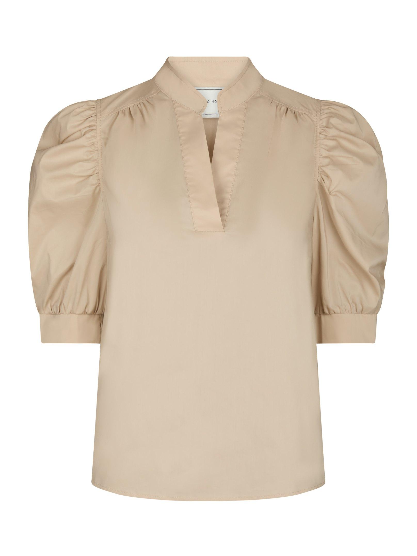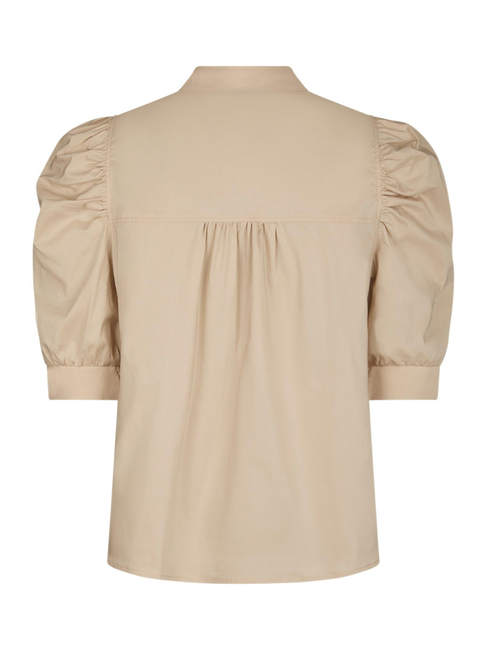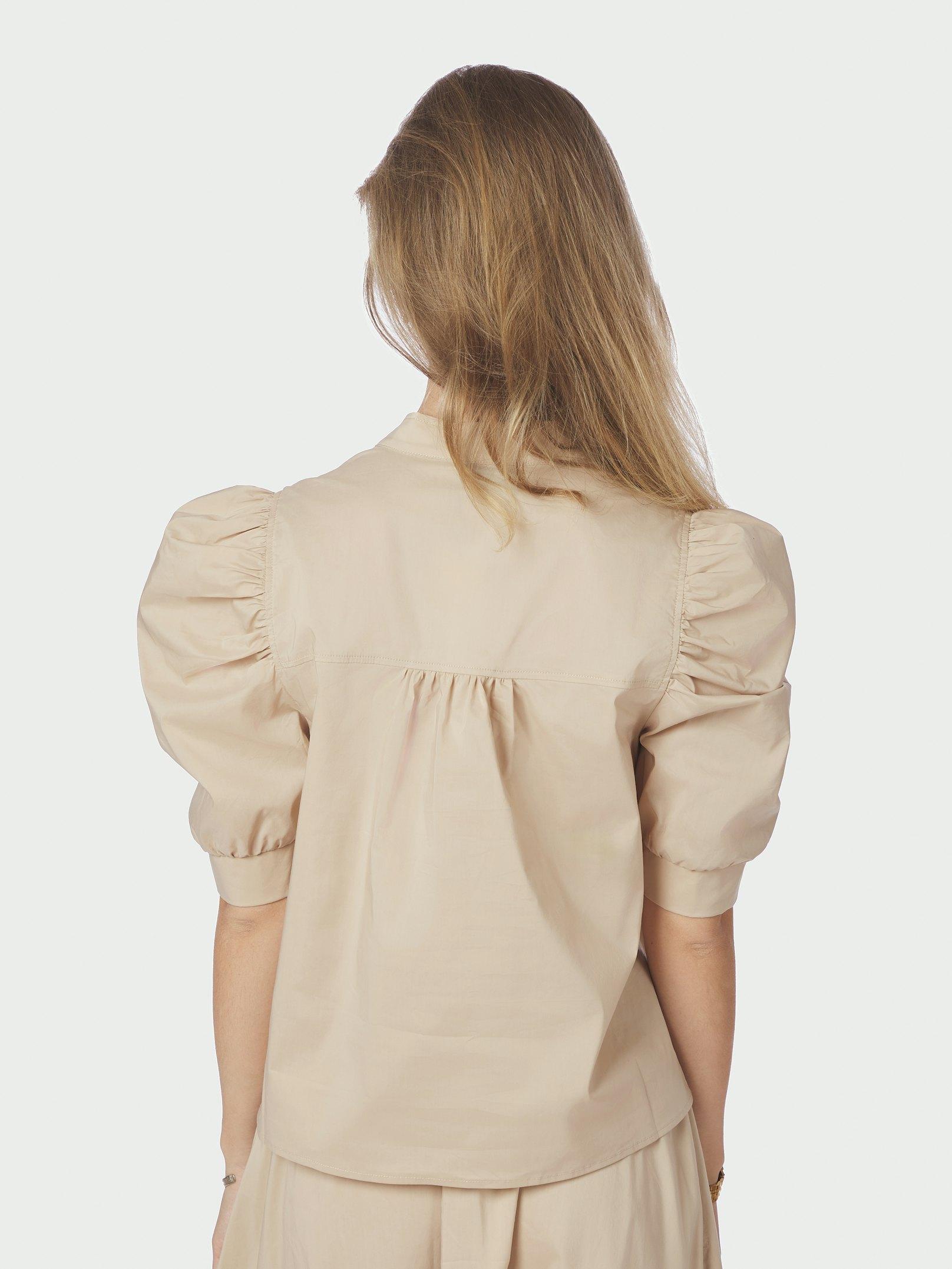 Roella Poplin Blouse in de kleur 'Dark Sand' van het Deense merk Neo Noir. Een vrouwelijke blouse met een sluiting aan de voorkant en pofmouwen. De stof is van mooie, kwalitatieve poplin en is afgewerkt met decoratieve stiksels.