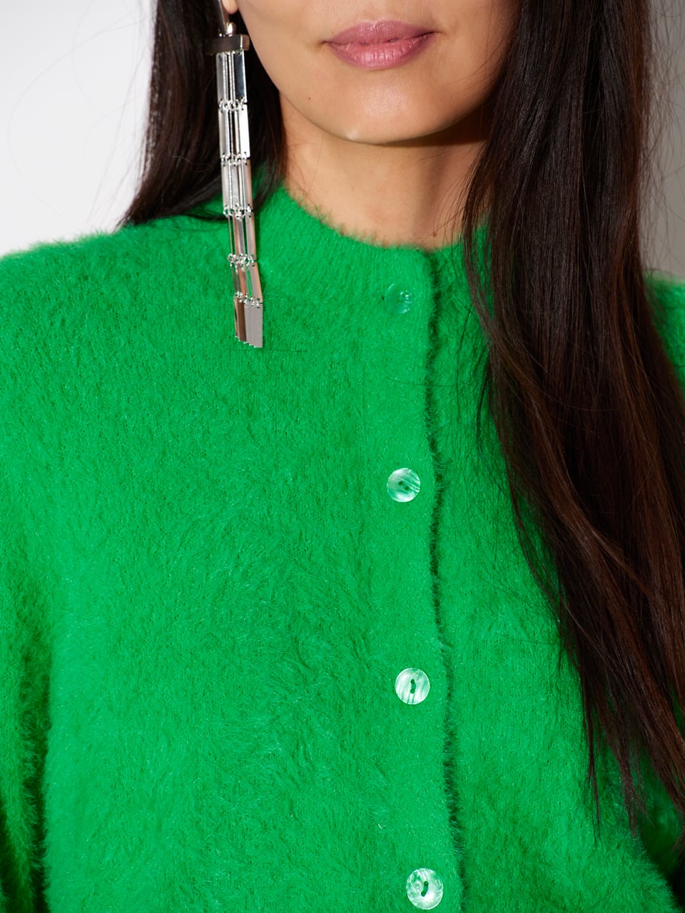 Maak een kleurstatement met de Meganne cardigan in Grass Green van Dante6. Deze fluffy knit van een polyamideblend heeft een hoge halslijn en halflange mouwen. De zachte textuur en het speelse silhouet maken dit een heerlijk draagbaar item. Draag ‘m als set met de Jules Crinkle broek of met je favoriete jeans.