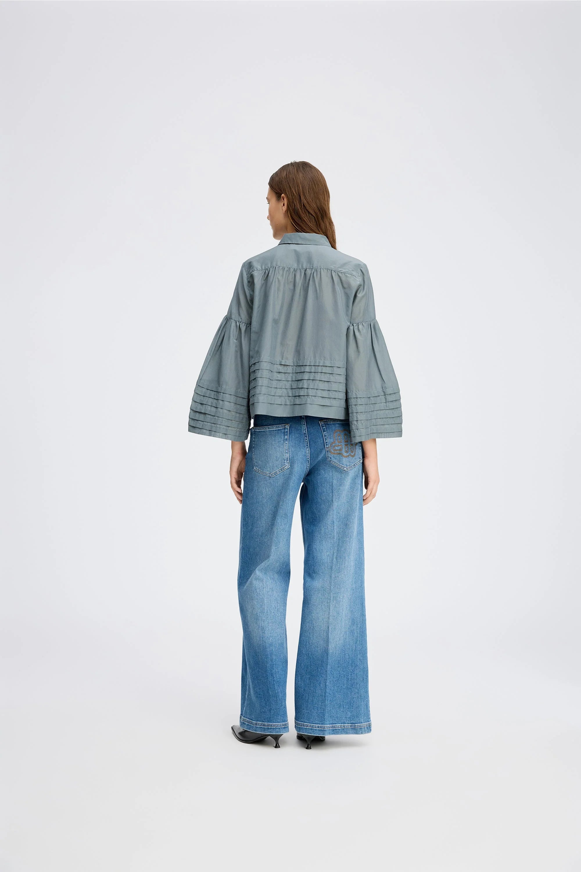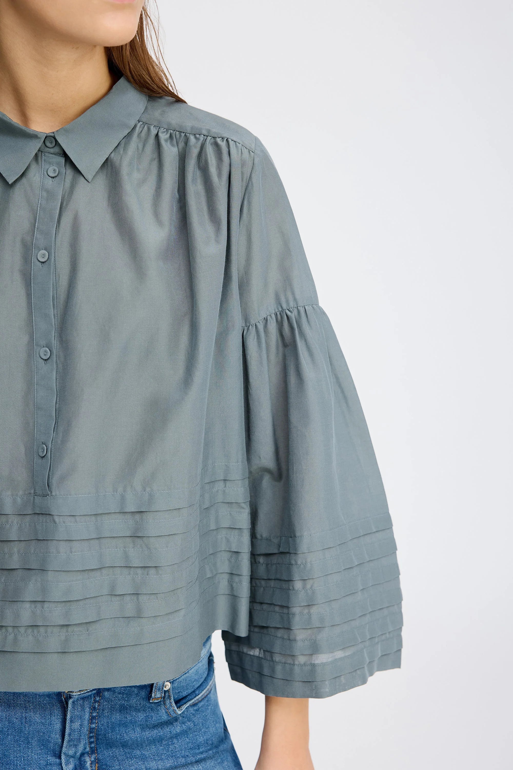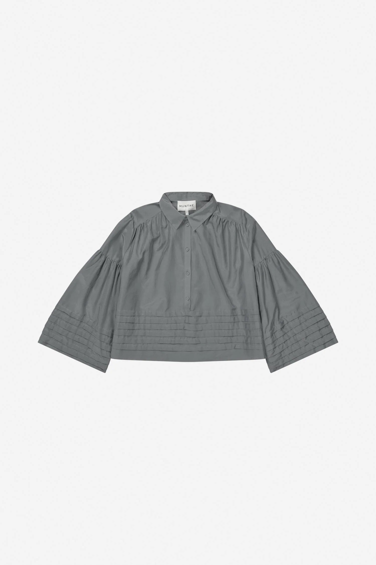 Rosalin Blouse van Munthe in de kleur 'Grey'. Elegante blouse met brede 3/4-mouwen en delicate plooidetails op zowel de mouwen als de zoom. De blouse heeft een losse pasvorm en kan tot halverwege worden dichtgeknopt. Gemaakt van een lenzing ecovero en zijde mix.