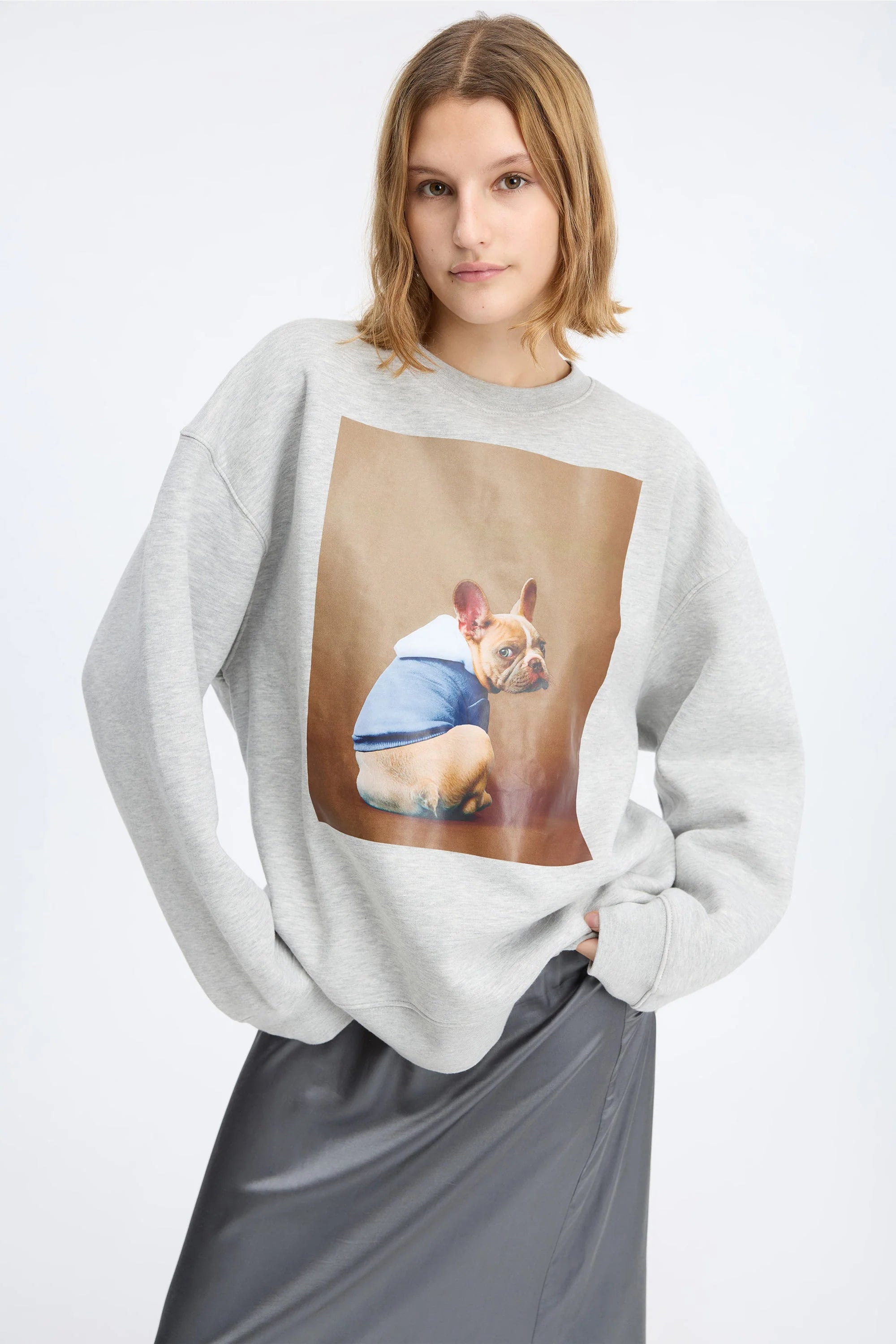 Roula Sweatshirt in de kleur 'Light Grey' van het Deense merk Munthe. Elegant sweatshirt met een charmante print van een Franse Bulldog in een hoodie op de voorkant en een MUNTHE-logo op de achterkant. Ontworpen met een klassieke ronde hals, lange mouwen en een losse, comfortabele pasvorm. Gemaakt van een katoen & polyester mix.