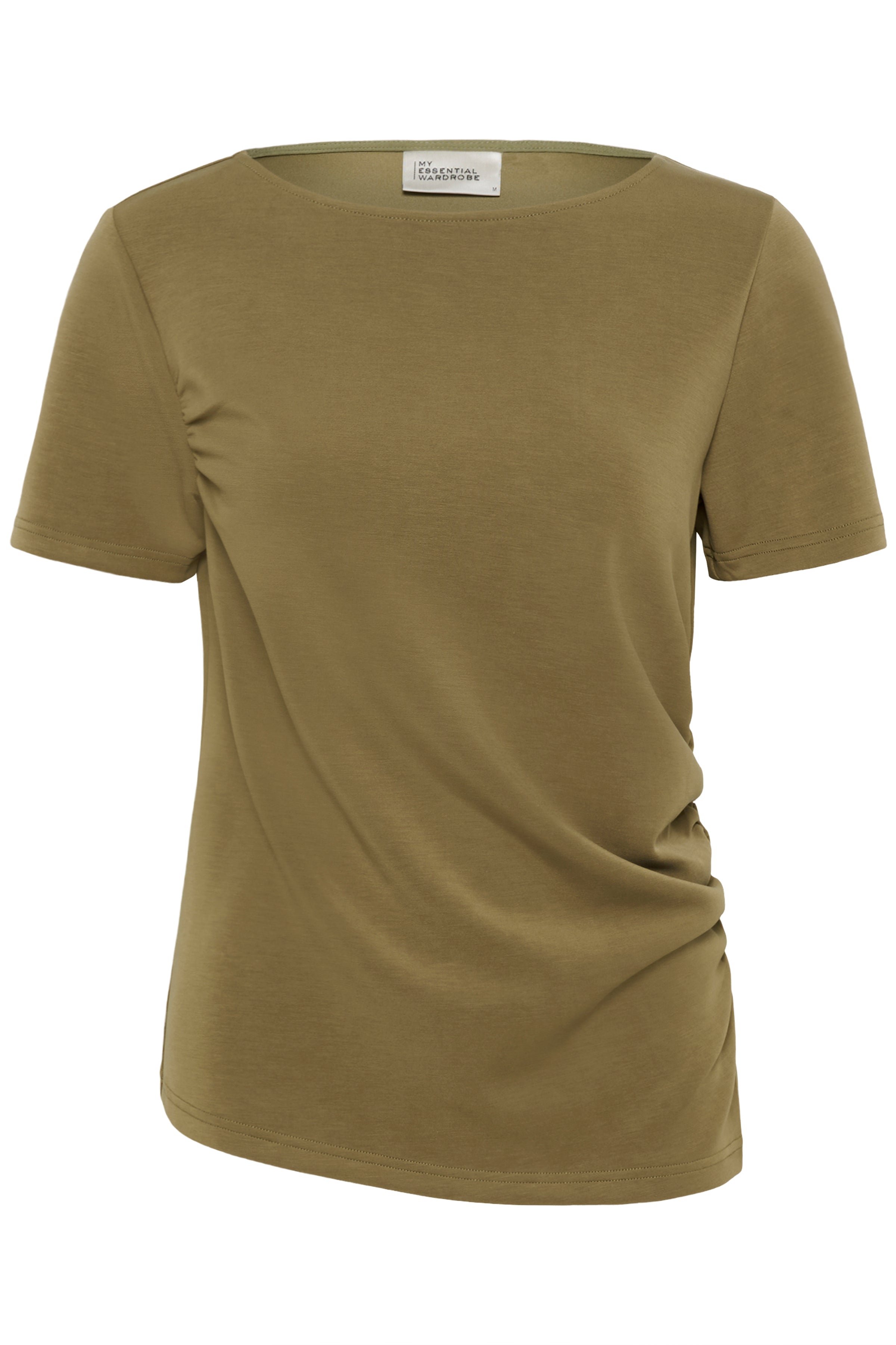 MWHelle Asymmetric Tee in de kleur Capers van het Deense merk My Essential Wardrobe. Coole asymmetrische shirt met een plooi detail aan de zijkant.