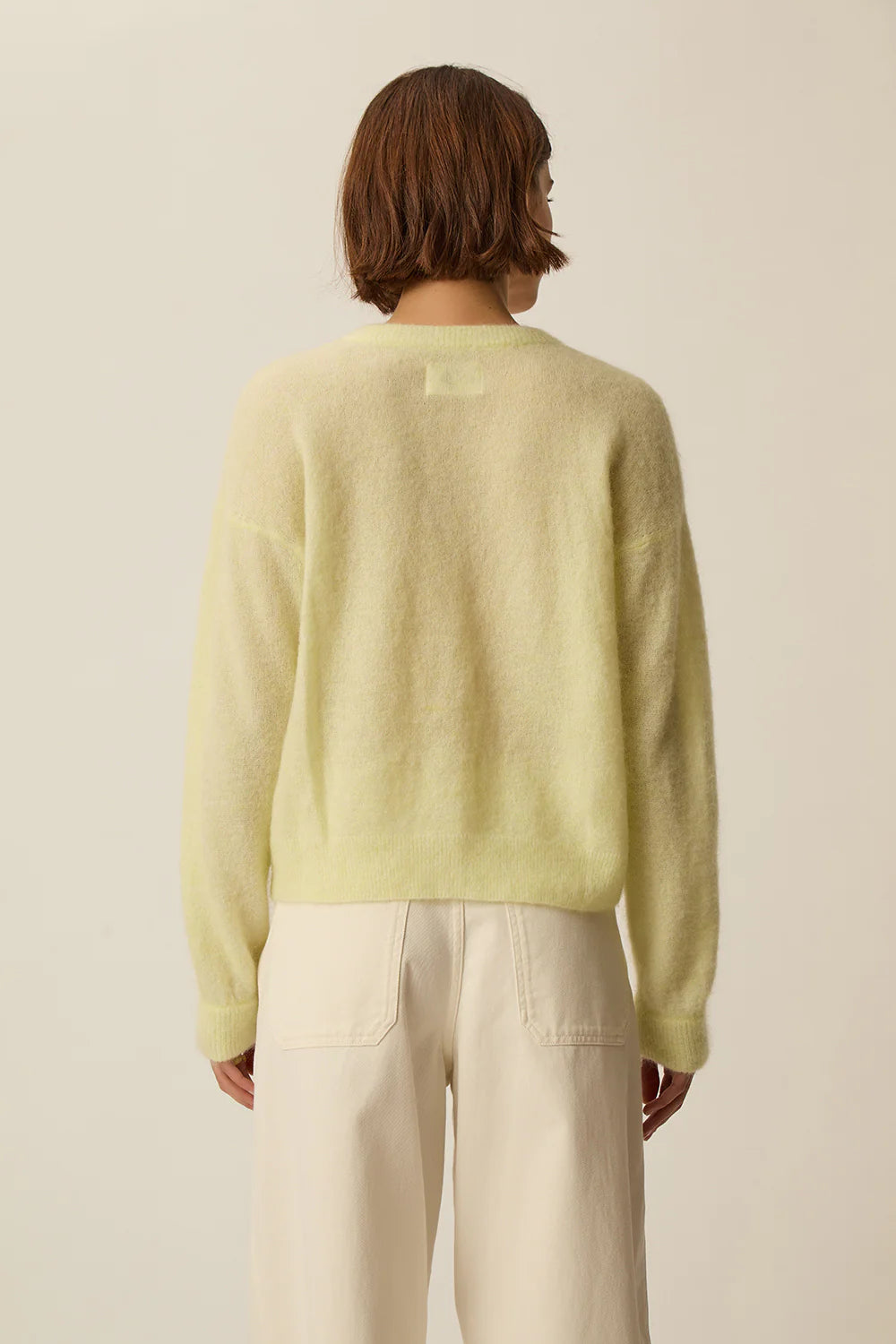 De Dobilou Gilet van het Franse merk Des Petits Hauts in de kleur 'Anis'. Mooi en zacht kid mohair vest met lange mouwen, knoopsluiting en twee steekzakken aan de voorkant. Draag hem als een licht jasje over een jeans of pantalon en je zult de zachte, luchtige gebreide stof heerlijk vinden.