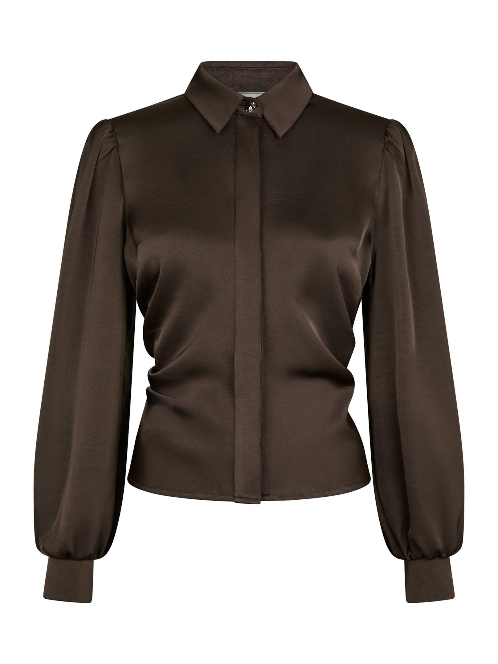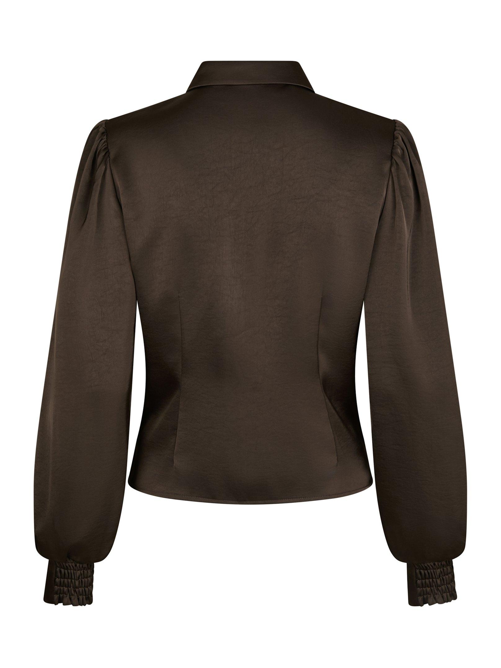 Fransala Heavy Sateen Shirt in de kleur Dark Brown van het Deense merk Neo Noir. Schattige blouse met lange mouwen, smockdetail in de taille, pofmouwen en een decoratieve knoop op de kraag aan de voorkant. Het model is 176 cm lang en draagt maat 36. Combineer met de Emmett Heavy Sateen Pants voor een mooie donkerbruine set!