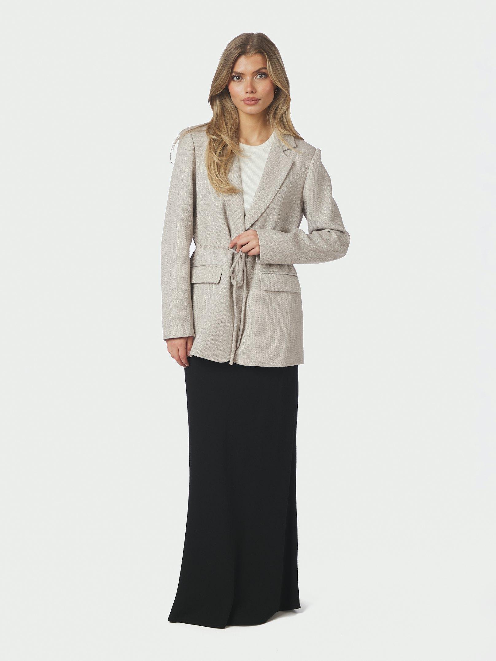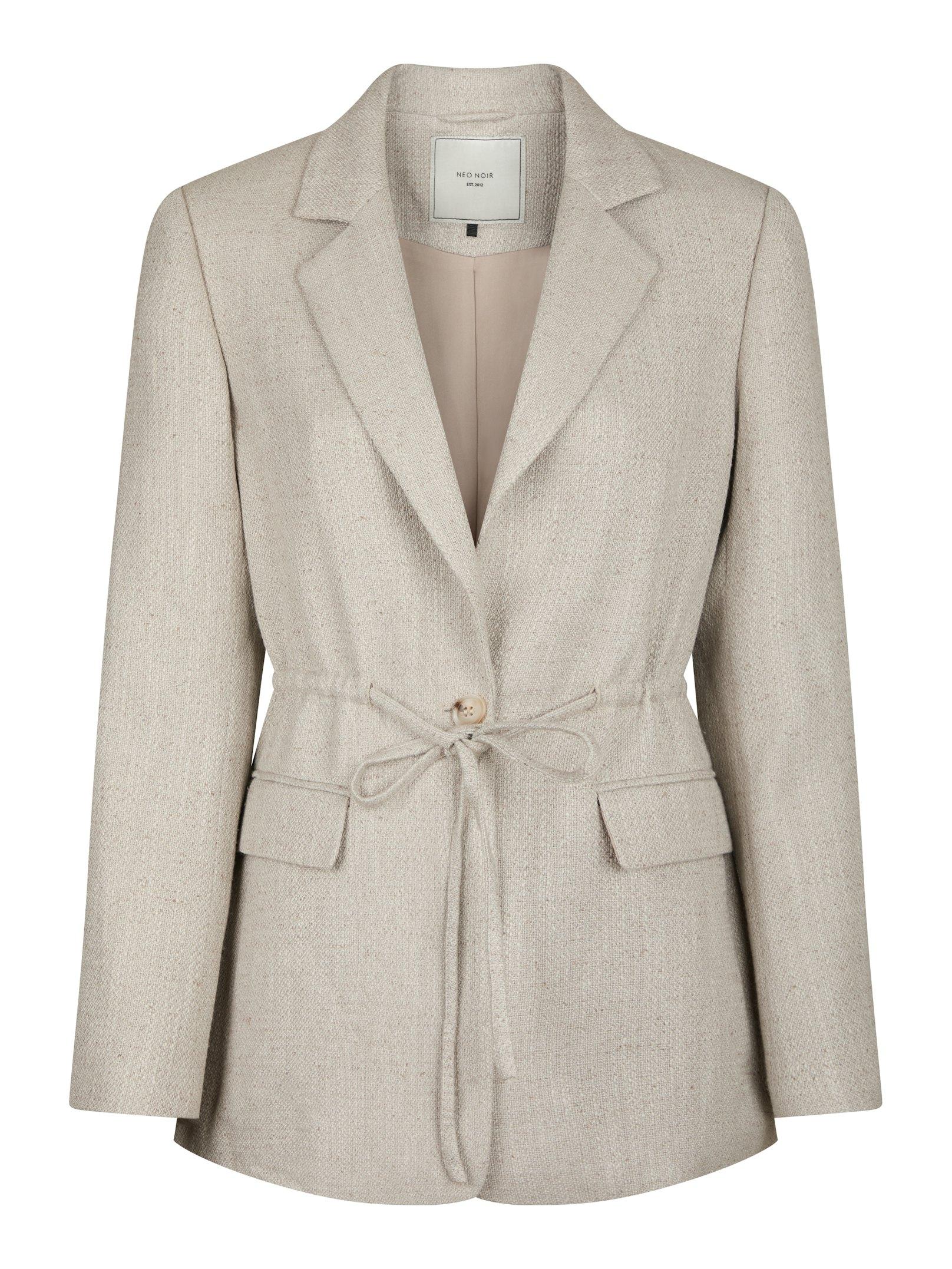 Jemmie Boucle Blazer van het Deense merk Neo Noir in de kleur 'Natural'. Blazerjasje van mooie bouclé-kwaliteit. Het jasje heeft strikbanden voor een moderne, elegante look. Volledig gevoerd. Het model is 176 cm lang en draagt maat 36.