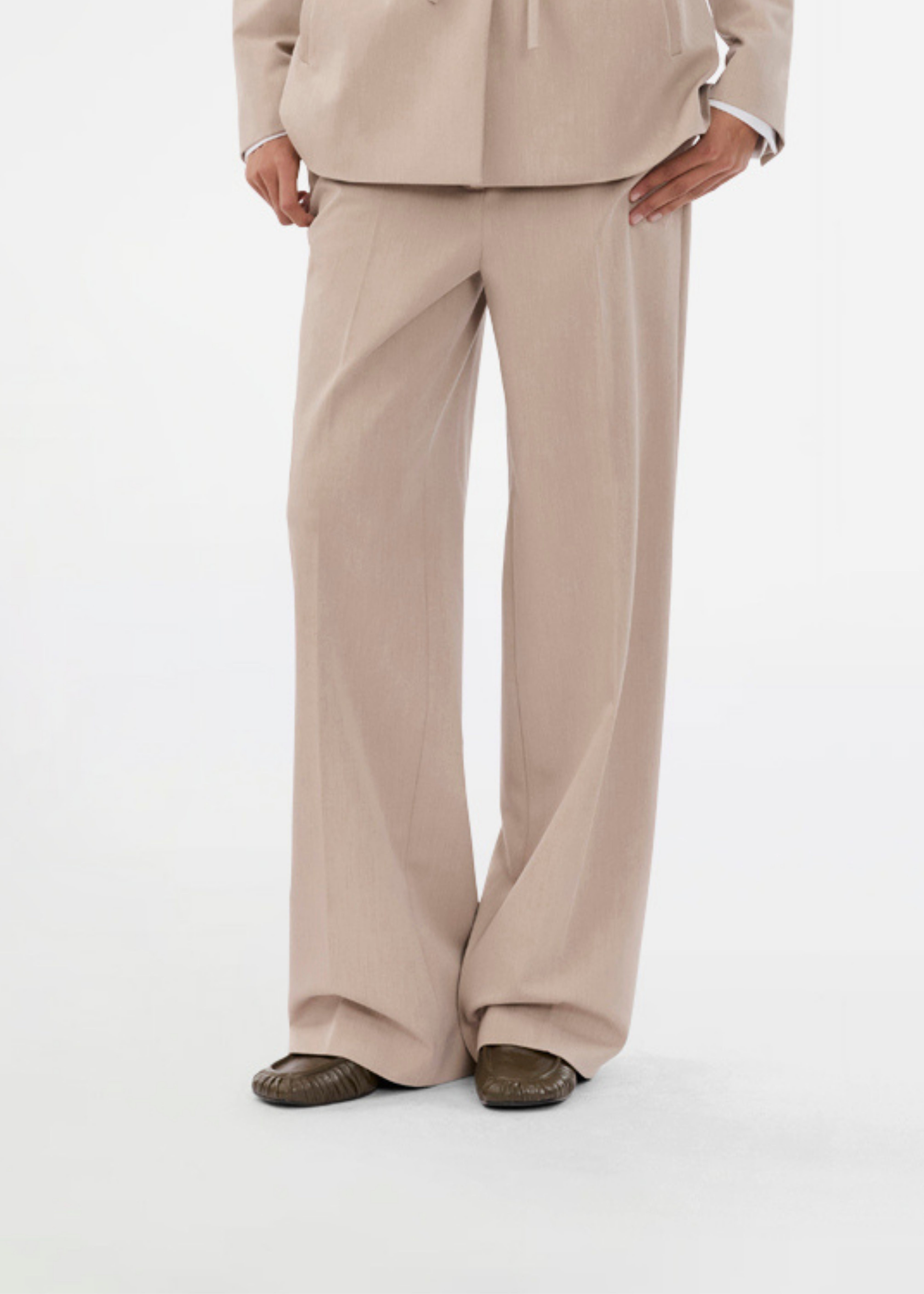 Uchemd Pants in de kleur 'Beige' van het Deense merk Modström. Mooie pantalon van een dikke linnen look kwaliteit. Recht model met wijde pijpen. De achterband van de broek heeft elastiek waardoor hij mooi aansluit.