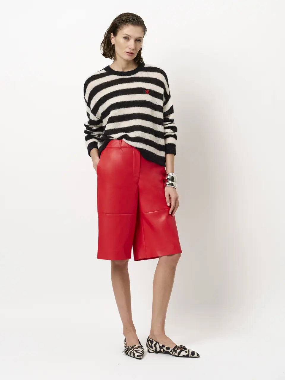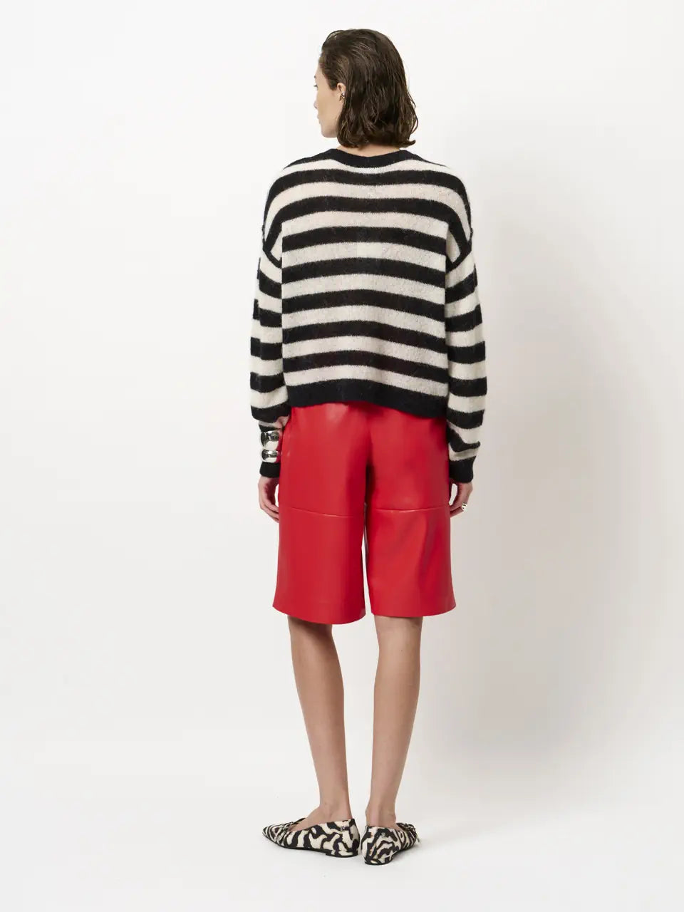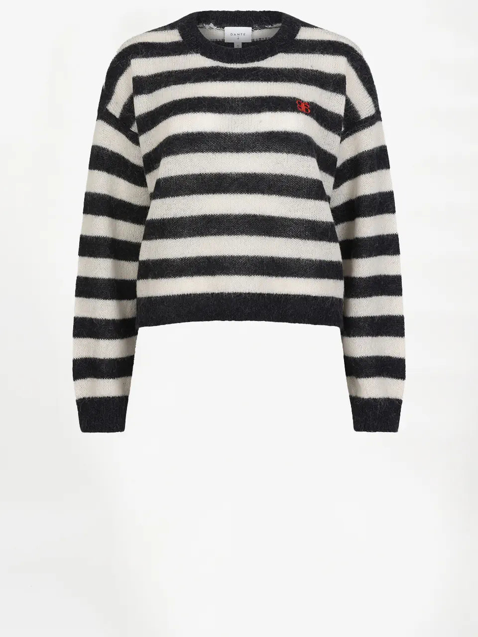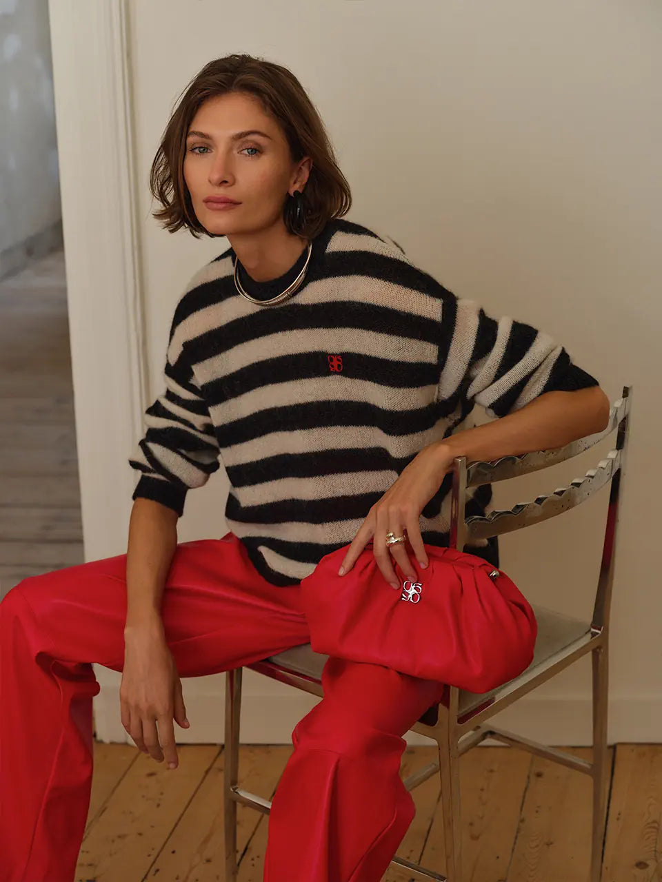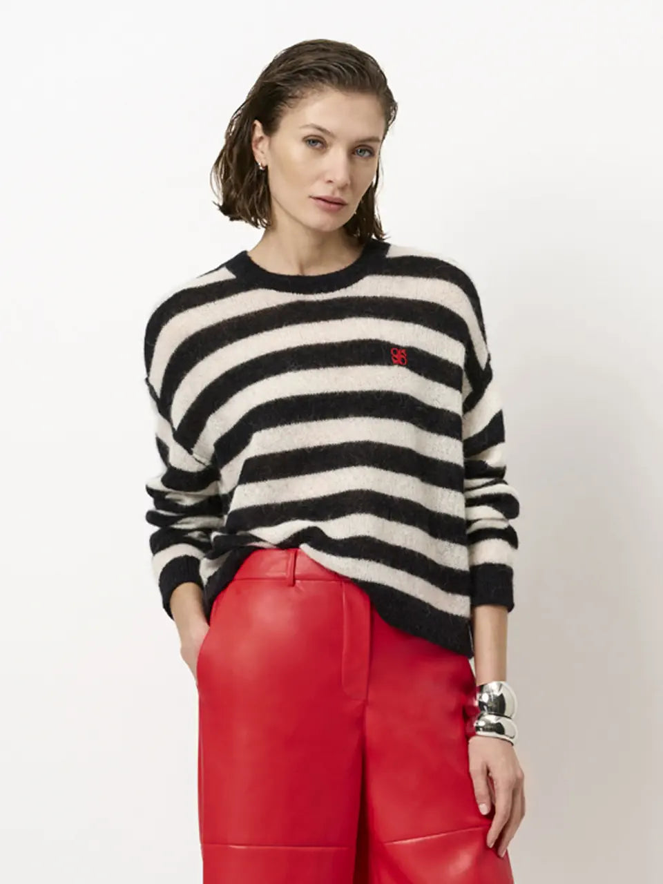 De Ariama trui in black & cream is precies wat je nodig hebt. Deze relaxed-fit stijl is gemaakt van een lichtgewicht alpacawolmix en heeft een geribde ronde hals, verlaagde schouders en lange mouwen met geribde boorden. Het zwart-wit gestreepte ontwerp is afgewerkt met een klein rood geborduurd logo aan de voorkant.
