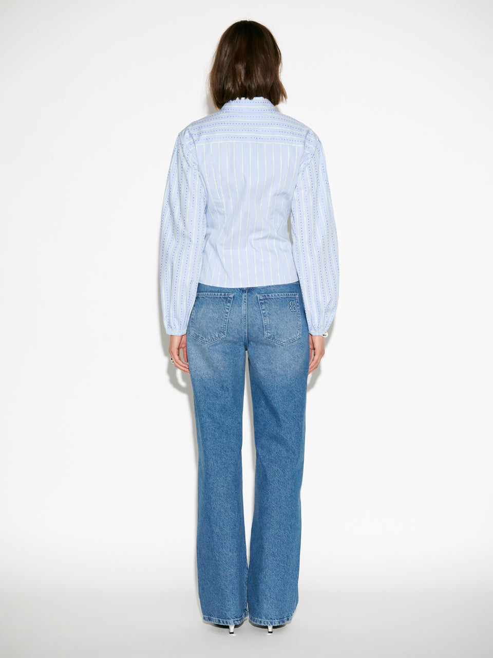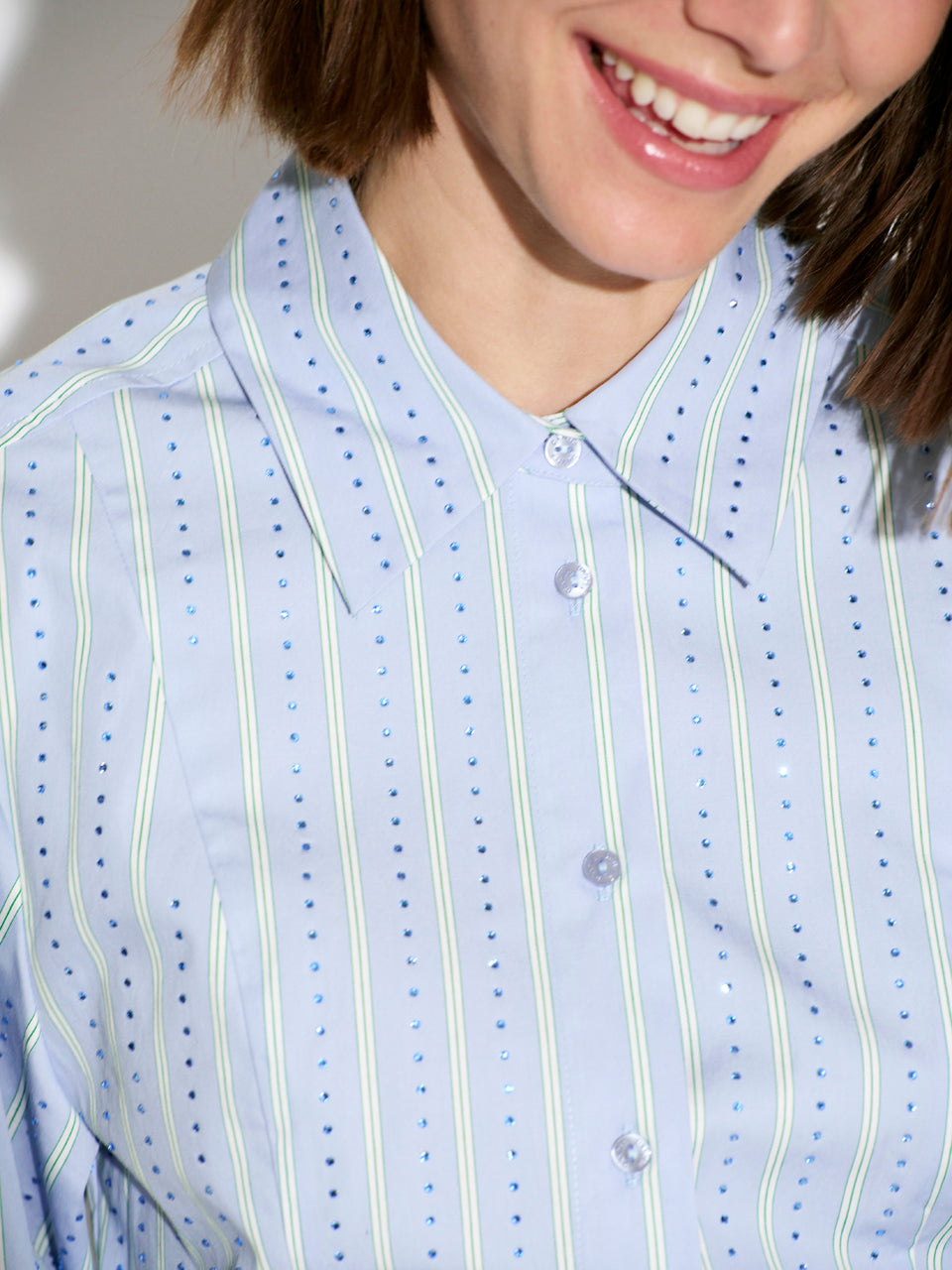 De Therese blouse in de kleur 'Blue Mist' van het Nederlandse merk Dante6 geeft een glamoureuze draai aan een klassieker. Gemaakt van 100% biologisch katoen en voorzien van een licht getailleerde pasvorm met subtiele plooien in de taille. De all-over strass-strepen zorgen voor een elegante sparkle.