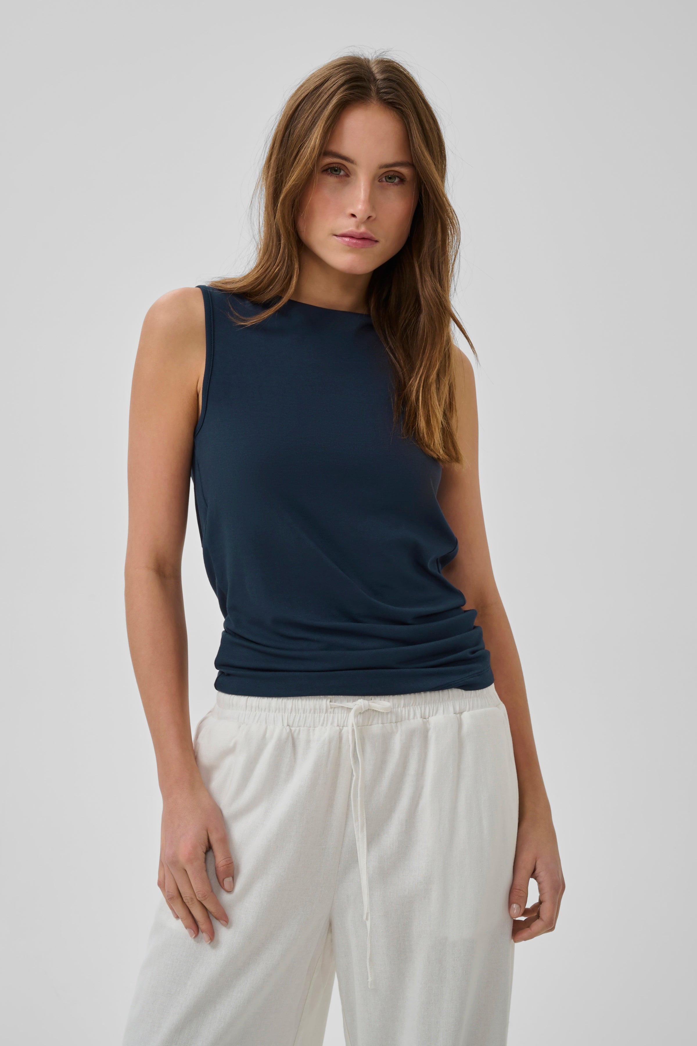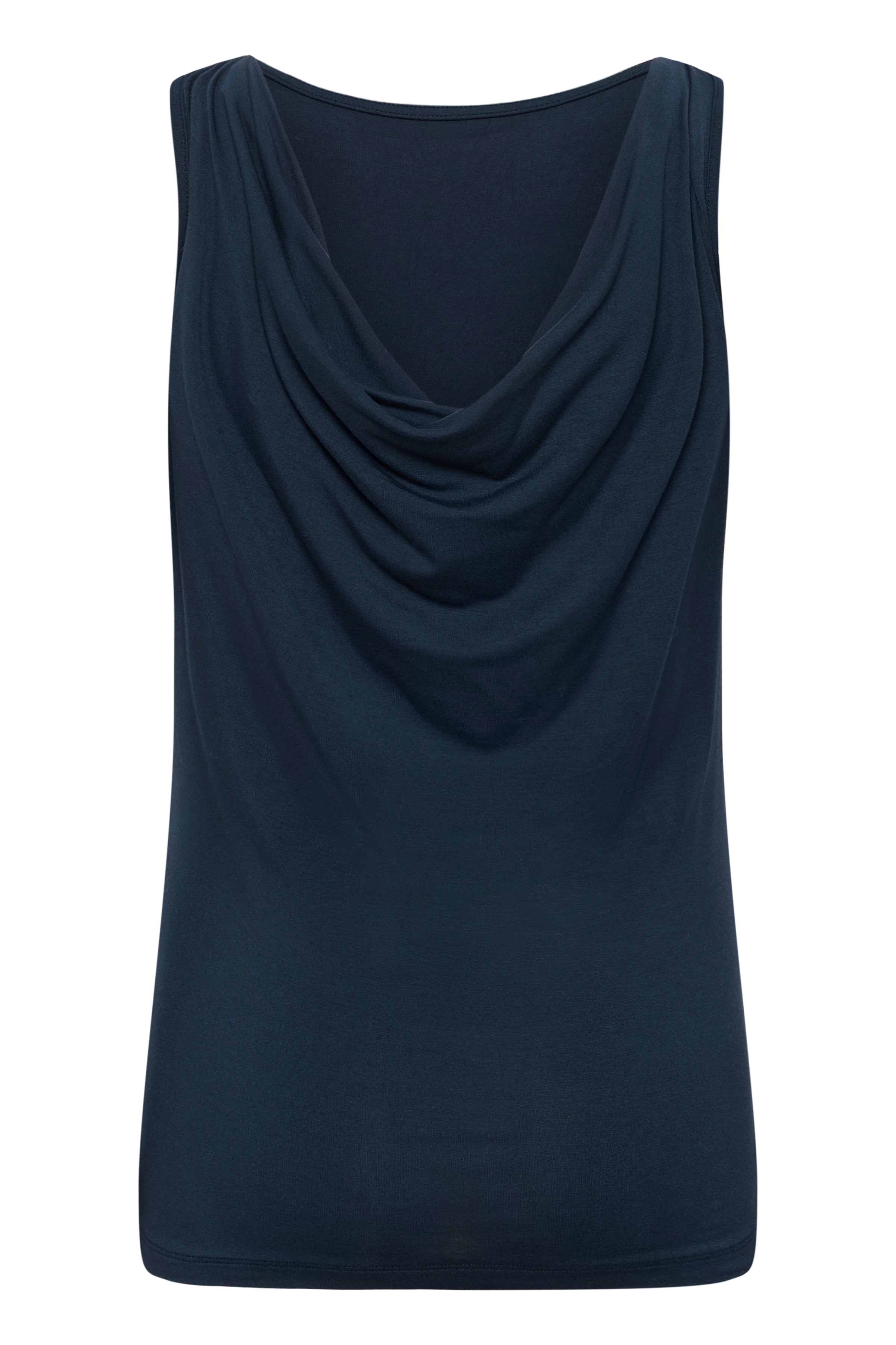 MWVista Waterfall Top in de kleur 'Dark Sapphire Blue' van het merk My Essential Wardrobe. Mooie aansluitende top met draperen effect. Kan aan beide kanten gedragen worden.