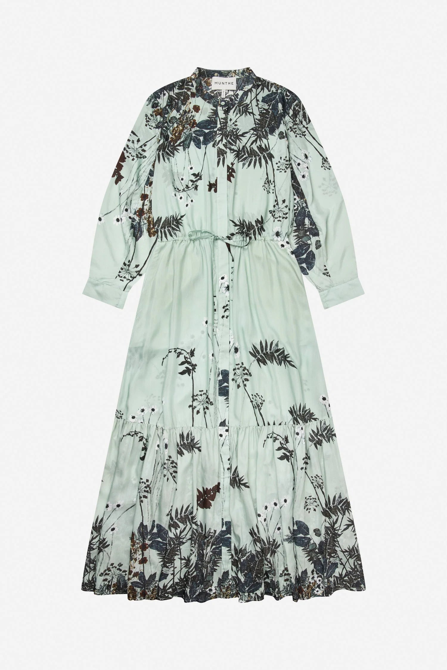 Bernadette Dress in de kleur 'mint' van het Deense merk Munthe. Jurk gemaakt van een lichte stof met een botanische print. Het is ontworpen met een knoopsluiting aan de voorkant, lange mouwen met manchetten en een trekkoord waarmee de taille verstelbaar is.