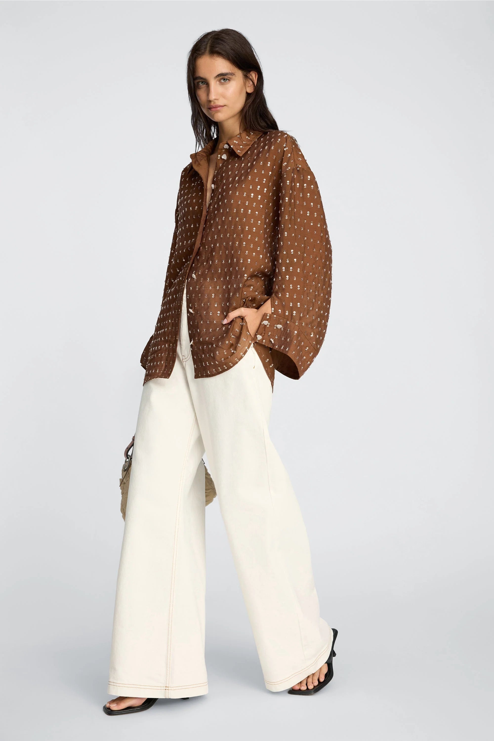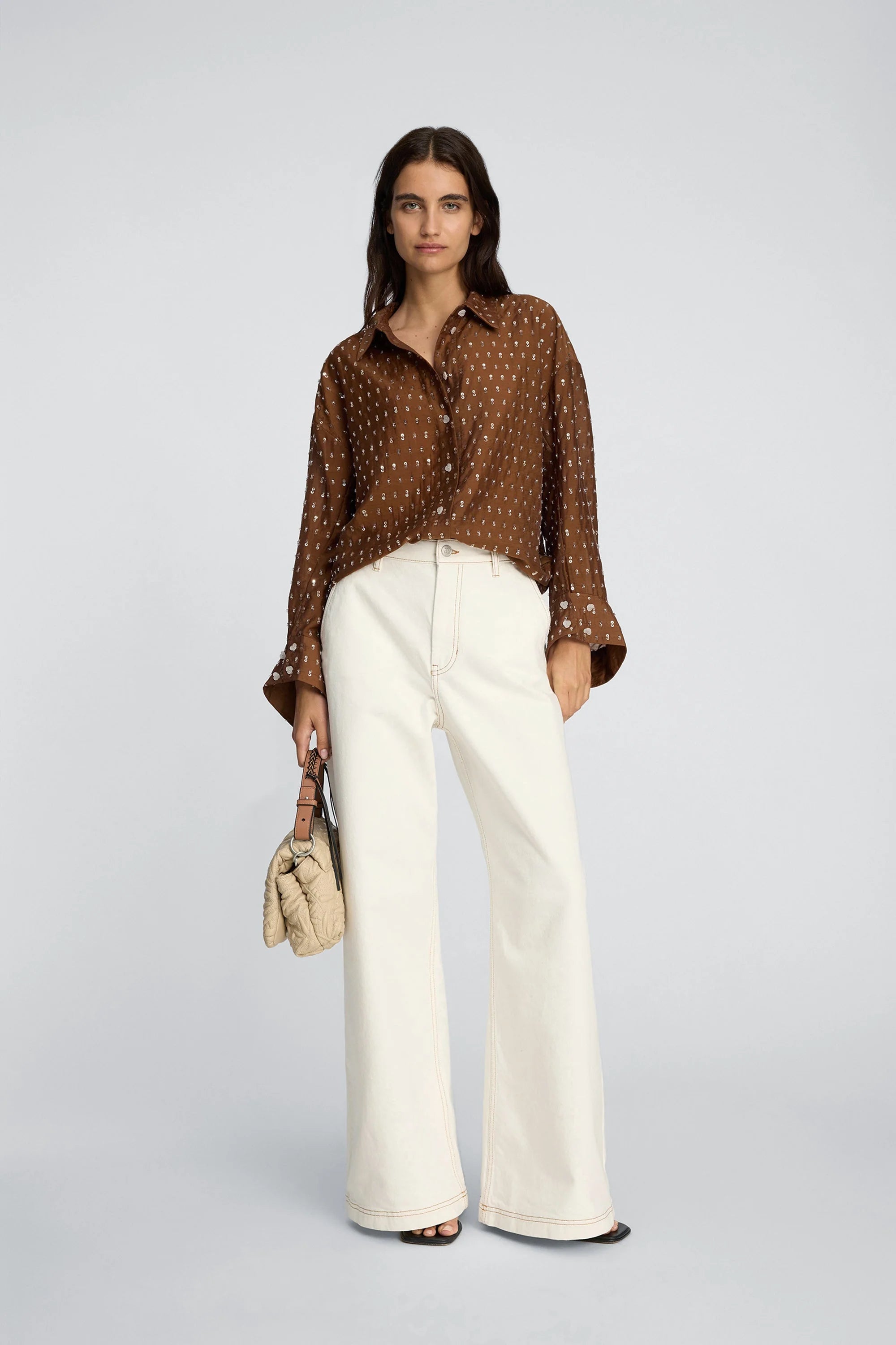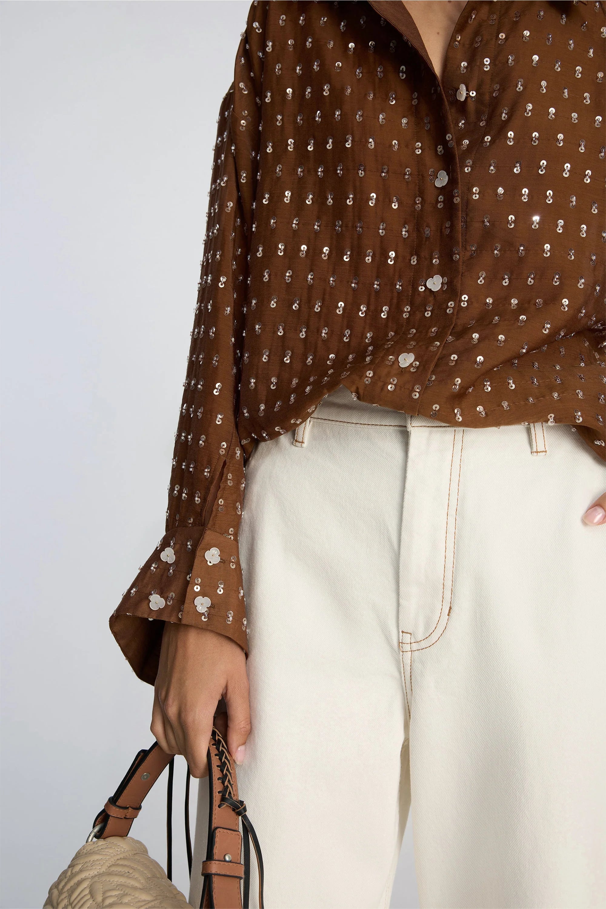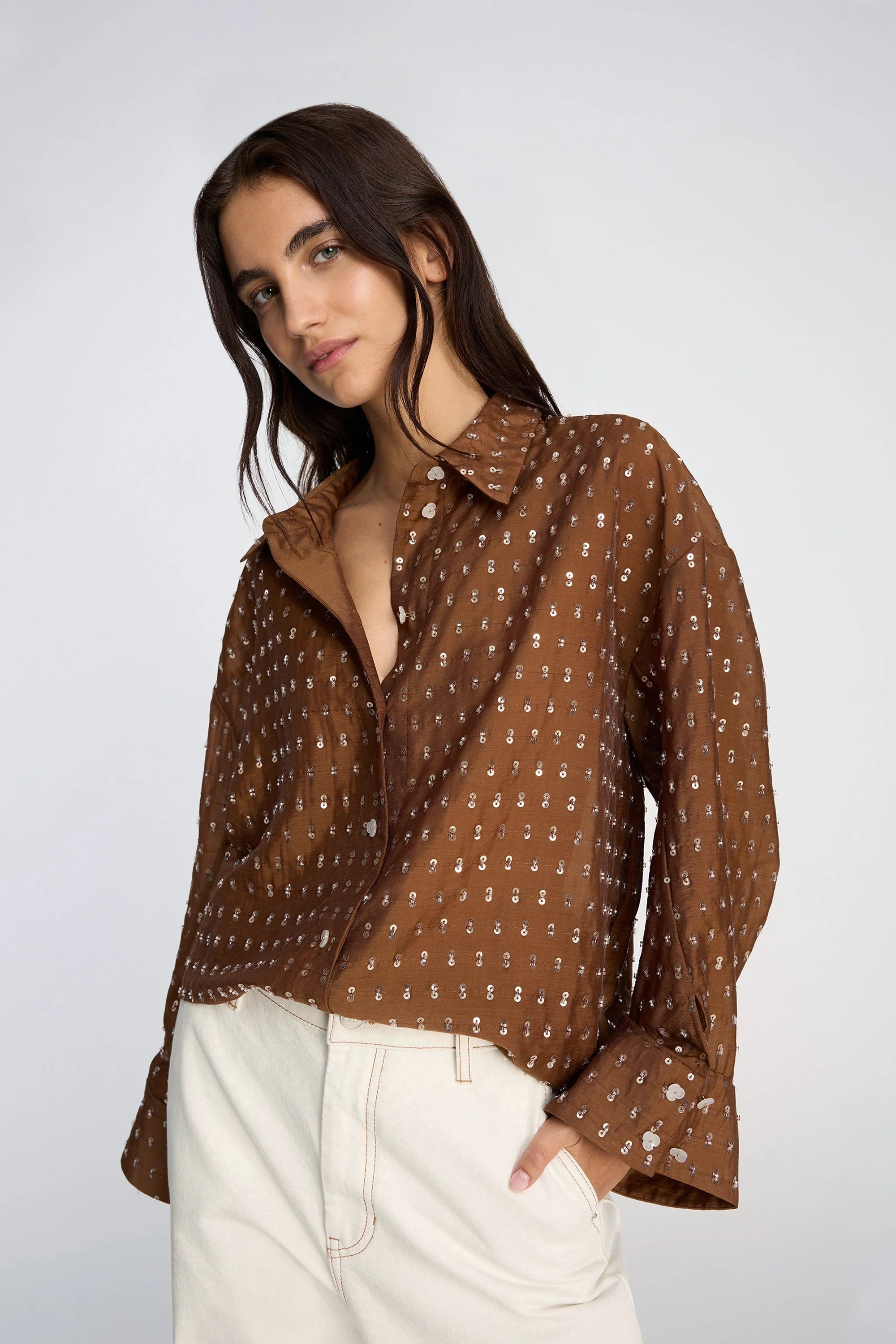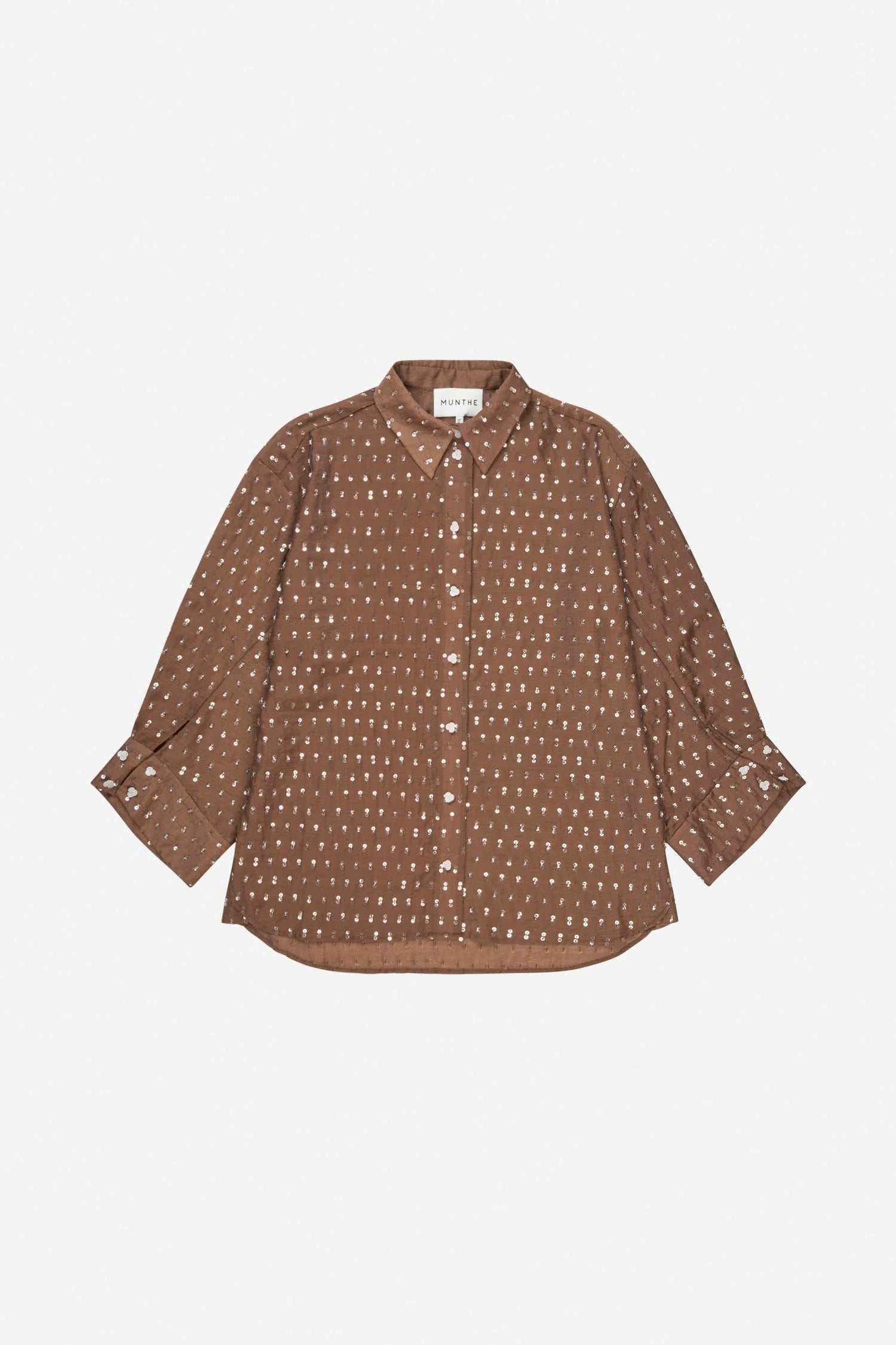 Bjarka Blouse in de kleur Mocca van het Deense merk Munthe. Overhemd met een oversized pasvorm en subtiele pailletten. Het is ontworpen met een klassieke kraag, knoopsluiting aan de voorkant en lange mouwen met brede manchetten.