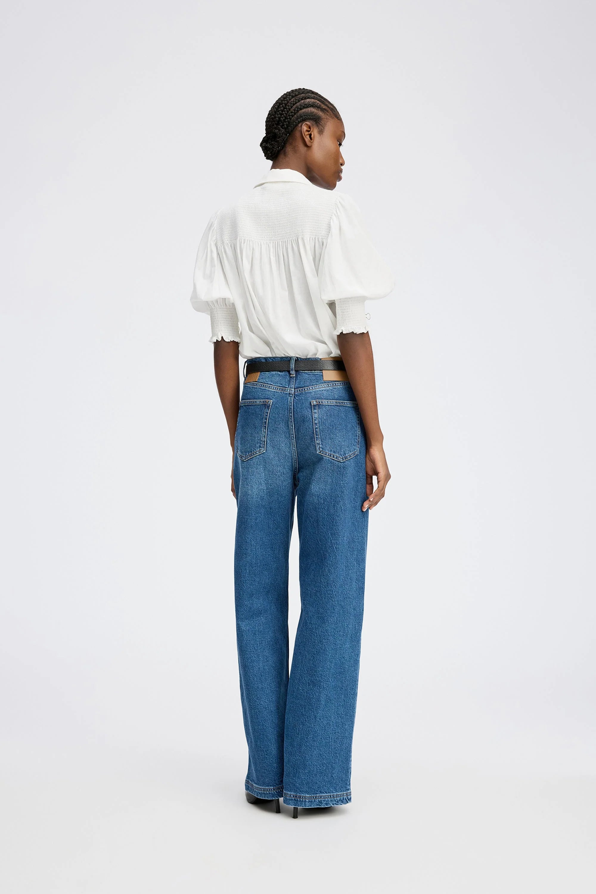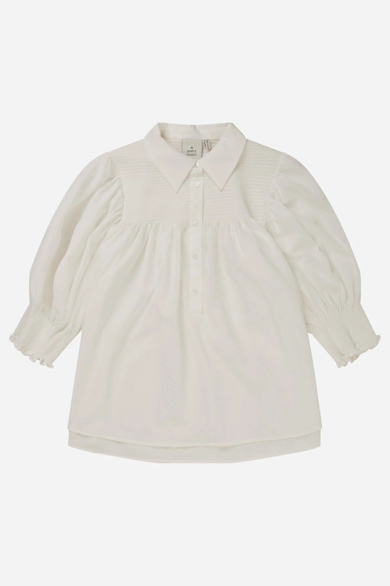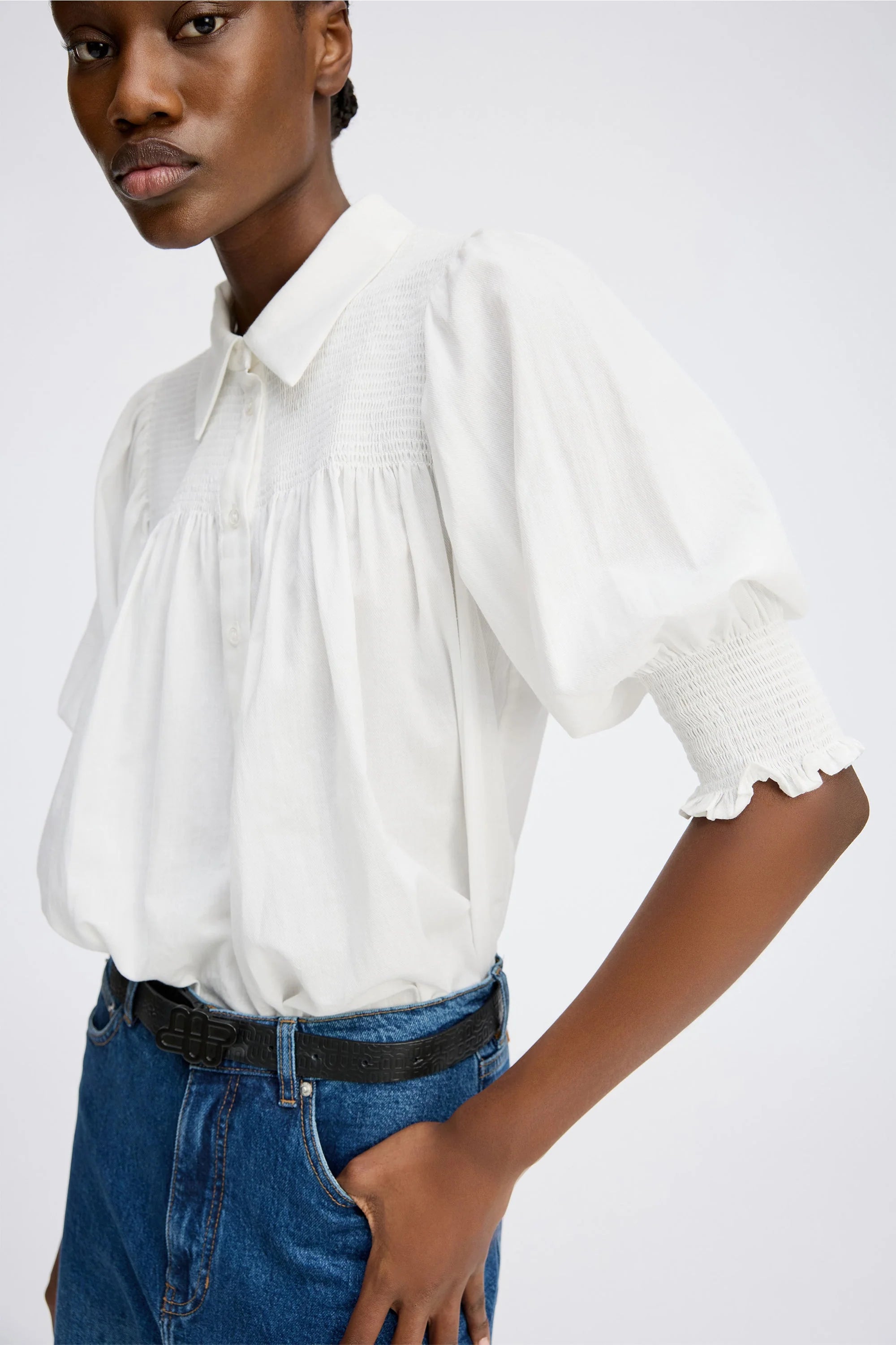 Chapter blouse van Munthe in de kleur 'Ivory'. Vrouwelijke blouse met prachtige smokdetails op de mouwen, borst en achterkant. De blouse heeft een kleine kraag en een elegante knoopsluiting aan de voorkant. Blouse komt uit de Simple Studio collectie en is daarom de perfecte basis. Gemaakt van 100% Katoen.