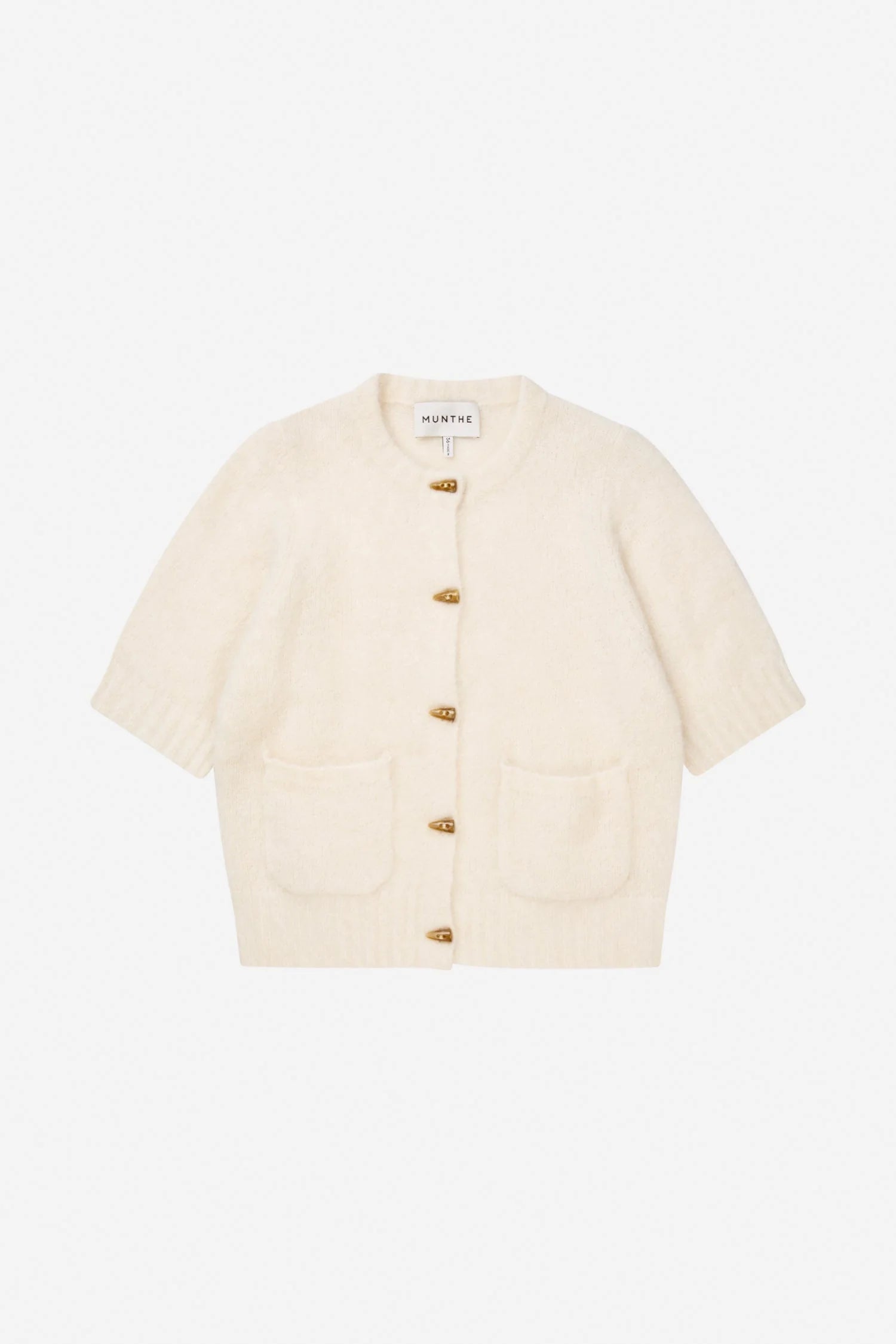 Locca Knit in de kleur Ivory van Munthe. Cardigan met korte mouwen, voorzakken en nephoornknopen. Deze cardigan is ontworpen met een elegante geborstelde afwerking en bestaat voor 55% uit alpaca.