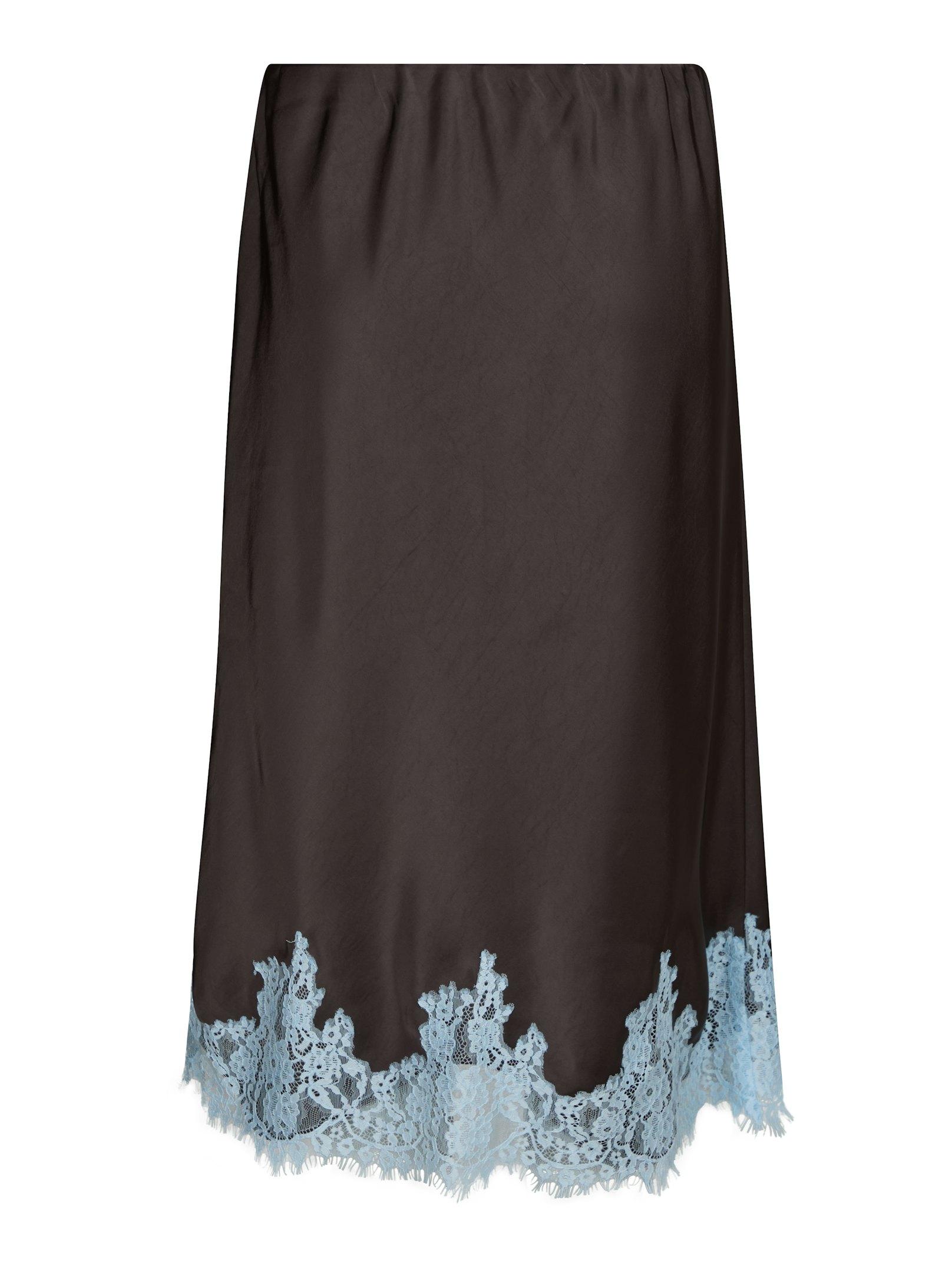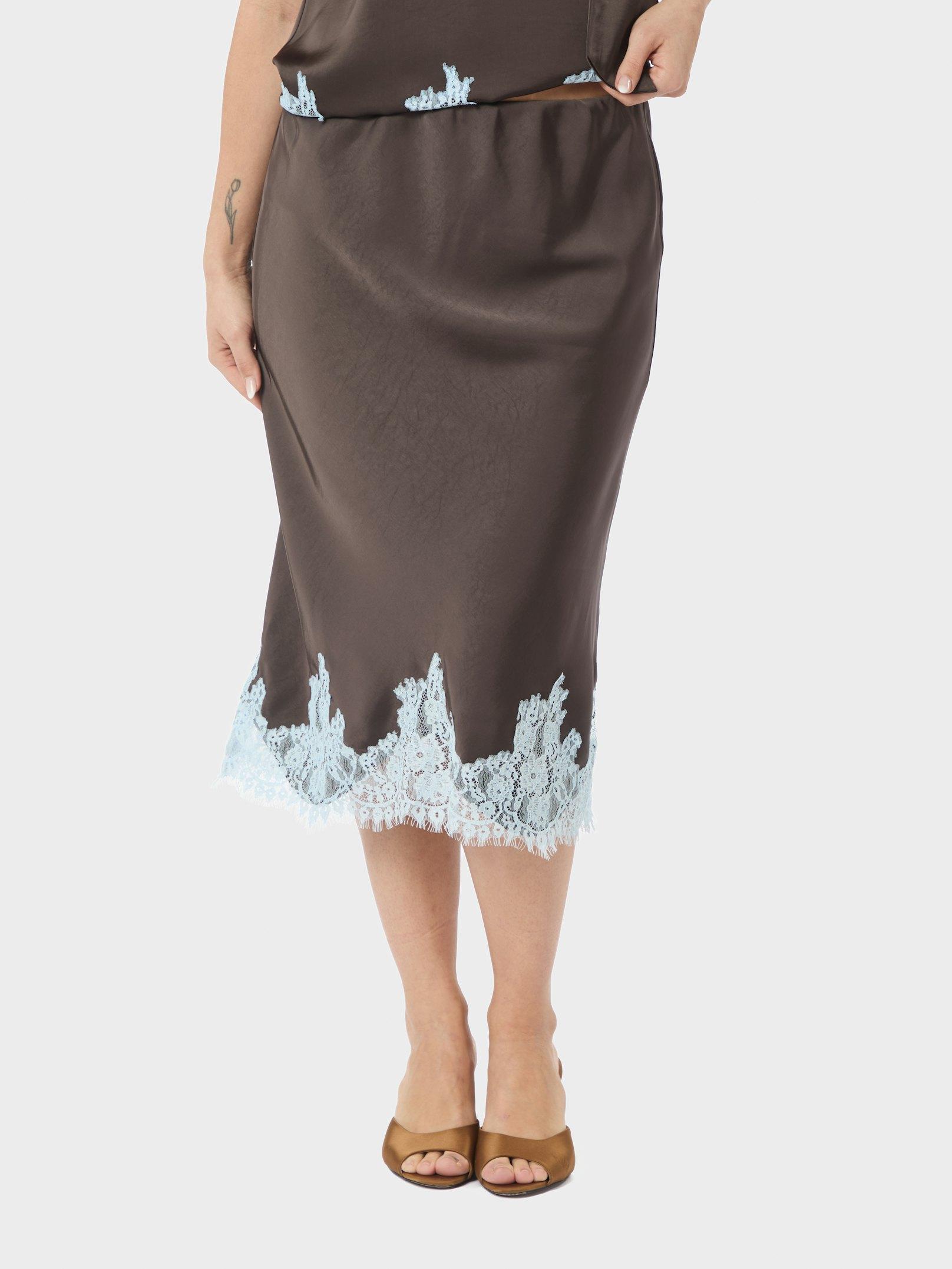 Naira Lace Skirt in de kleur 'Dark Brown' van het Deense merk Neo Noir. Lange rok met elastiek aan de binnenkant in de taille. De rok is diagonaal gesneden en heeft een mooi kanten detail aan de onderzoom. Het model is 176 cm lang en draagt maat 36.