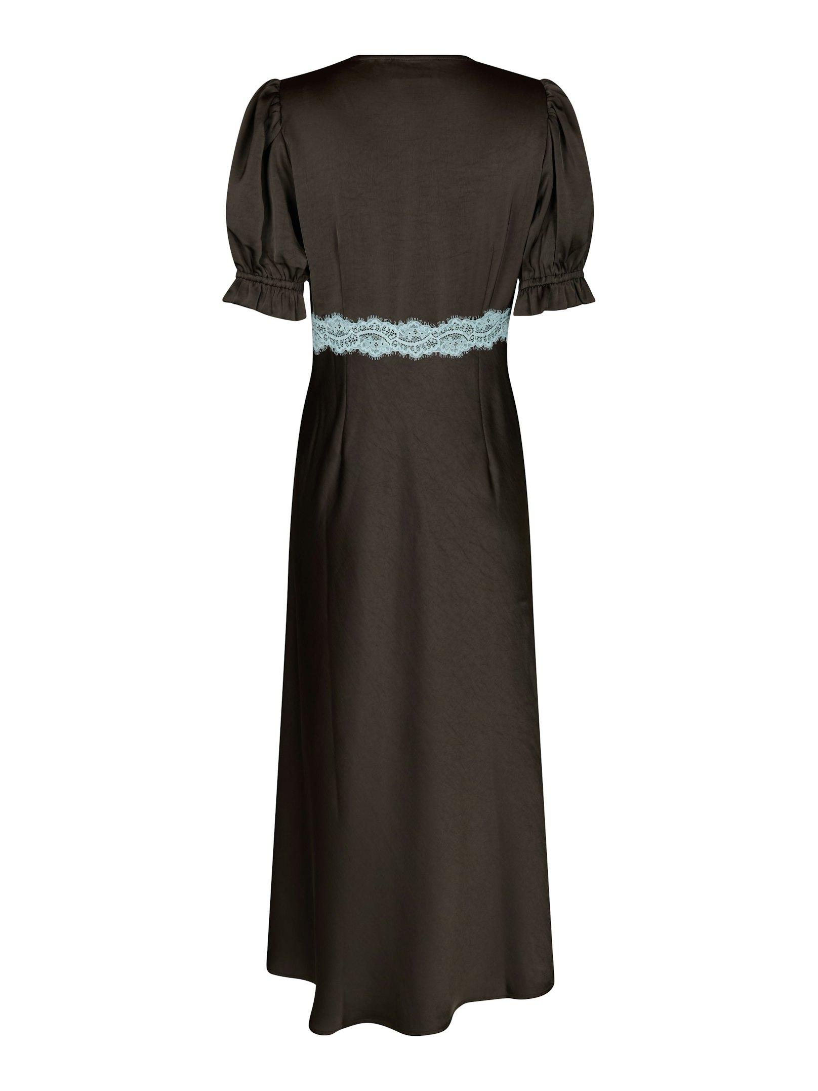 Vipe Lace Maxi Dress in de kleur 'Dark Brown' van het Deense merk Neo Noir. Mooie lange jurk met blauwe kanten details. Met een v-hals en pofmouwen. Sateen look stof. Het model is 176 cm lang en draagt maat 36.