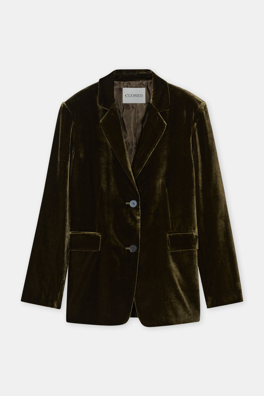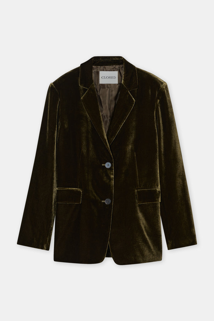 Lola Blazer in de kleur Marsh Green van Closed. Prachtige velvet look blazer in een mooie groene kleur. Gemaakt van soepel fluweel met een vleugje zijde, valt luxueus en zacht. Hij heeft een relaxte pasvorm met klepzakken, knopen in hoornlook en een binnenzak met knoop. De voering is gemaakt van soepele viscose. Kan gecombineerd worden met de bijpassende pantalon voor een compleet pak.