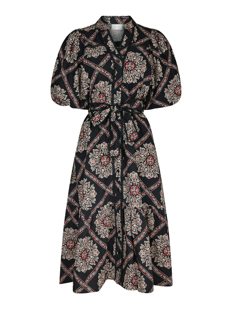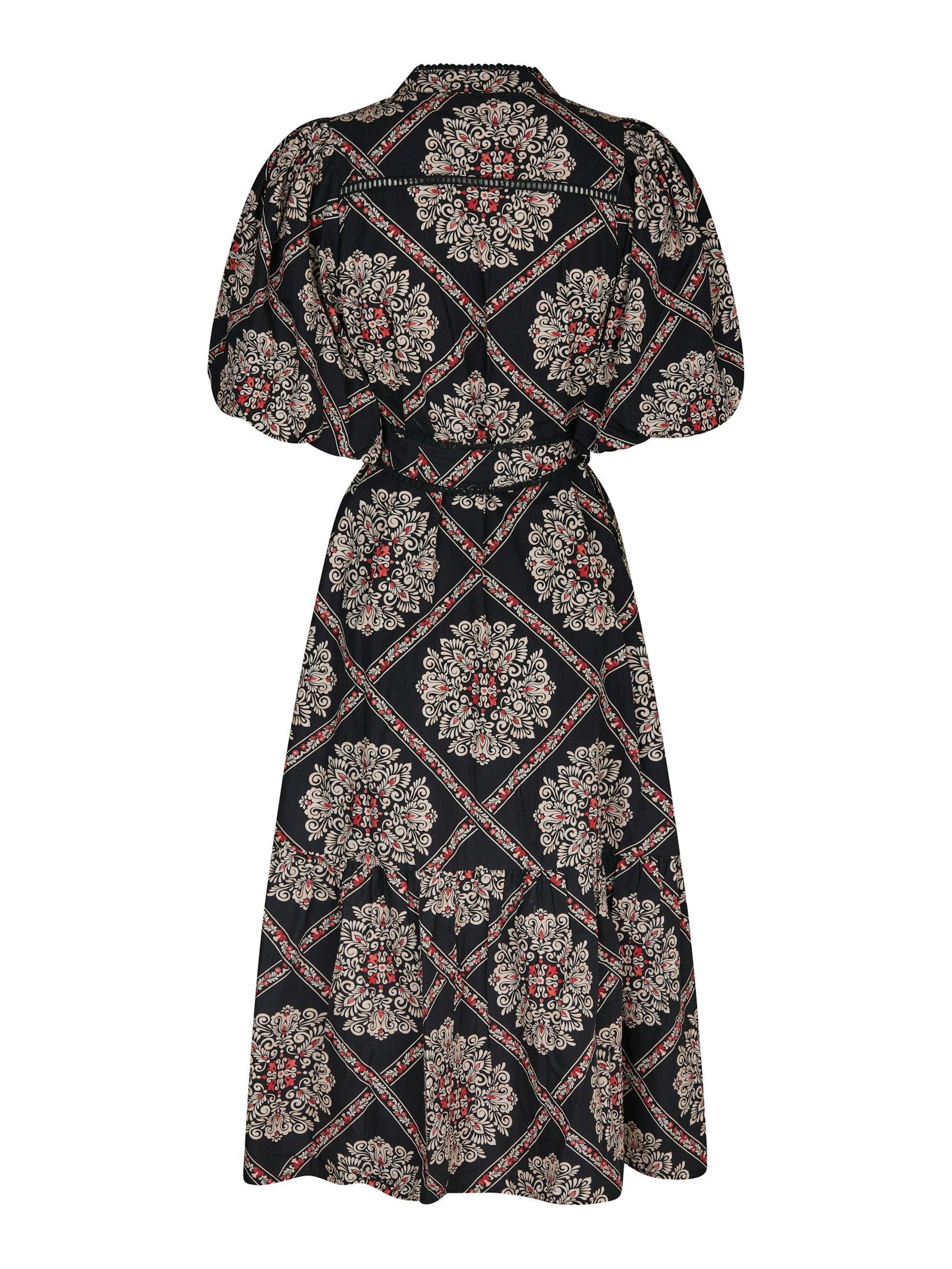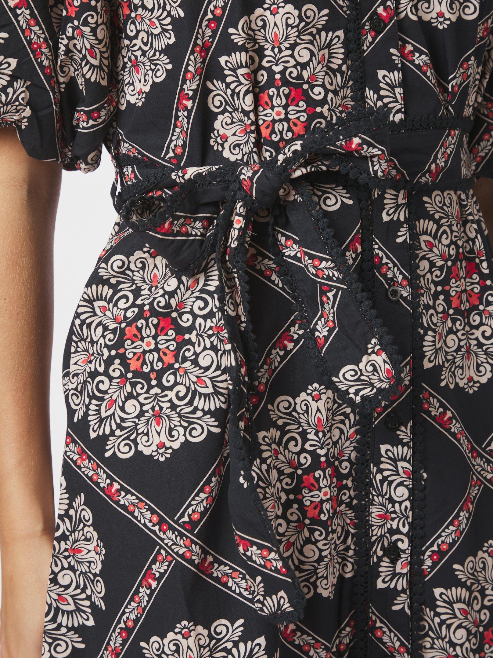 Margarita Pure Boho Dress van het merk Neo Noir. Schattig overhemdjurkje met ruches aan de zoom en pofmouwen. De jurk is gemaakt van een mooie katoenkwaliteit met een grafische print en kanten inzetstukken. Leuk om te combineren met hoge laarzen en een stoer jasje. Het model is 176 cm lang en draagt maat 36.